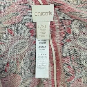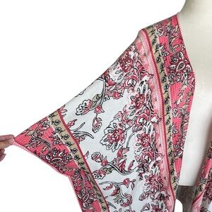 Chico's kimono with pink and white patterns. Lightweight and stylish.
