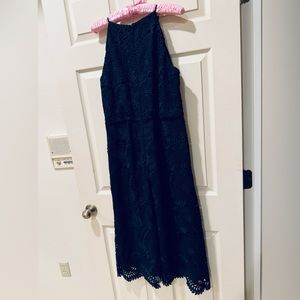 This is a gorgeous dress in a rich, substantial lace. Fully lined in navy satin. MIDI length. Purchased at Chico’s in Ft. Worth, for my granddaughter’s wedding. Worn a few hours for a wedding. Original dress price $199. Will be lovely for any season because of the satin lace. No smoking and no pets home. Items I list are my own.