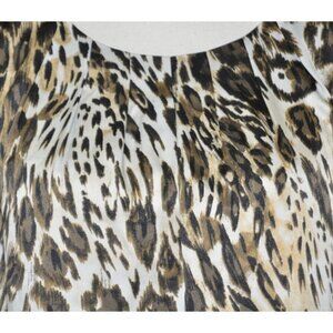 Elegant Chico's ladies blouse in size XL, adorned with a mixed animal print. This sleeveless top features a pleated collar, adding a unique touch. The cheetah pattern gives it a bold, stylish look. Great for casual or formal occasions.