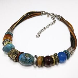 Chico's Large Blue Brown Beaded Suede Leather Cord Necklace, 20 Inches