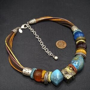 *Description: Beautiful Chico's choker length necklace with large beads which include a robin's egg bead, heart square brass bead, and spacers that are crochet covered bead rings. The 20 Inch length includes the extension chain. Nine strands of a variety of leather & suede cords in browns & golds.