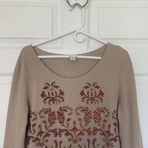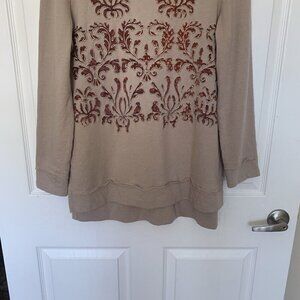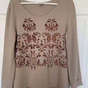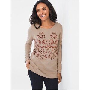 Chico’s Large Size 2 US 12 Brown Tan Paisley Appliqué Zenergy Sweatshirt Sweater