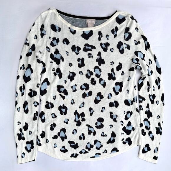 Chico’s Leopard Animal Print Soft Blue Cream Black Knit Sweater