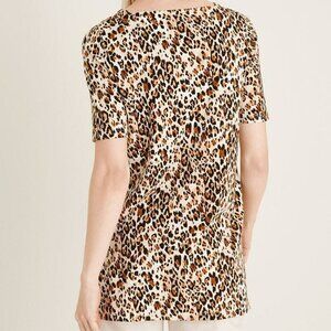 Chico's jaguar print square neck tunic top in women's size 2 Petite, equivalent to a size Petite Large. Missing fabric content tag but it's cotton knit. Elbow length sleeves. Tunic has side slits and pockets - still sewn shut. Gently pre-owned.