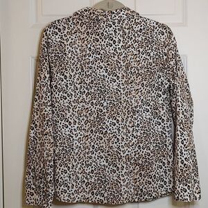 Chico's Leopard Print No Iron Long Sleeve Button Down Blouse. This blouse features a collar, long sleeves, and shaping seams on the front and back for a feminine fit. 100% cotton in a size 1 (M)