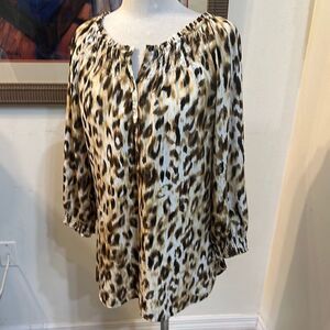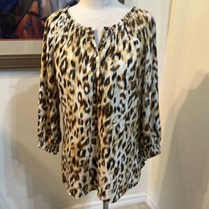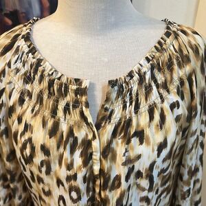 So cute! Stylish leopard print top with a comfortable fit. Perfect for any casual outing. It is gathered at the sleeves and the neckline. Such a fabulous fit and it is in perfect condition!