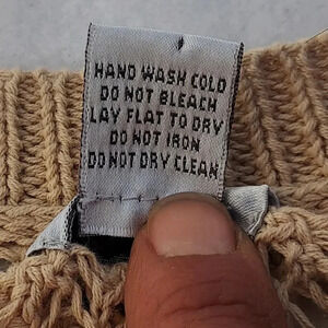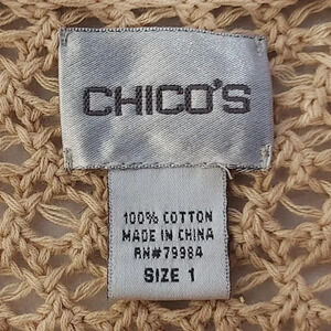 Chicos Light Brown/Gold Glittered Open Knit Sweater Size 1. A Round neck and figure-skimming fit give this sweater effortless polish, while the open knit lets pretty bottom layers peek through. Please, See Pictures to see Exact Sweater and Measurements and also see picture of fabric if you zoom in you are able to see the Gold Glitter in the fabric!100% Cotton.
