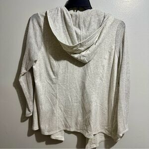 Elegant light gray cardigan with a hood. Features a textured sleeve design. Ideal for layering.