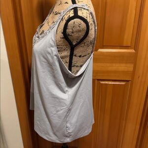 Chico's tank top in light gray. Features delicate lace trim. Ideal for versatile styling.
