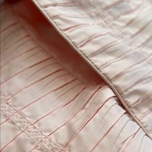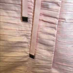 This light pink puffer jacket in excellent condition features a quilted texture and drawstring-tie collar. Its fitted silhouette and hip-length design offer a stylish and comfortable fit and its lightweight composition makes it perfect for Spring.