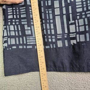 Chico's lightweight blue-gray burnout jacket features geometric pattern with easy open-front design and 3/4 sleeves. Rayon-blend fabric offers soft drape for versatile layering over jeans, trousers, or basics. Like-new condition with no flaws; measurements shown in photos.