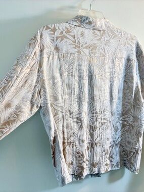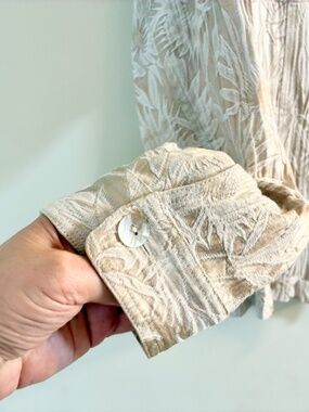 Gorgeous, elegant and super feminine Chico’s lightweight jacket/button up top. Beautiful cream color with stunning pattern. Super silky, soft and comfortable. Rarely worn, excellent condition. Chico’s size 2.