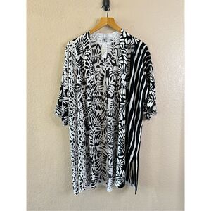 Open front, lightweight cardigan. Short sleeves and long line. Top has an artistic print with animal print, botanical leaves and stripes. Features slits at sides. Layer over a cami or t-shirt. Could also use as a swim cover up. Size 2 in Chicos converts to size Large US.