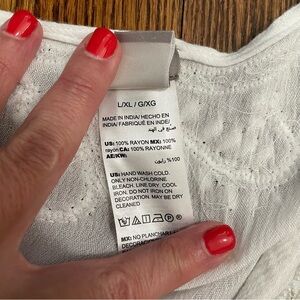 This is a fun, white beaded ladies Chico's shirt. It has a v neck and is beaded half way down the front and around the back of the neck at the collar. There is also a tie tassel at the front. The sleeves are bat wing like. The shirt is super lightweight, perfect for warmer weather and is made of 100% rayon. It is a Chico's L/XL which is 14/16.