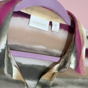 Chico's Chiffon Long Sleeve Collared Purple Beige Resort wear Tie Waist Button Top Size 2 Large. Excellent Pre owned condition.