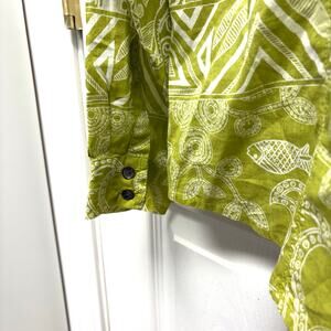 This blouse from Chico's has a geometric white pattern on lime green cotton. It is a button down style with the ability to hold up rolled sleeves with a tab. The top is a Chico's size 2 which translates to a regular woman's medium.