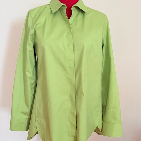Chico's button-down shirt in a refreshing lime green. Classic collar and long sleeves. Ideal for versatile styling. Great with jeans or a slim skirt. The color is outstanding. Used once. No-iron. Ready just for you.