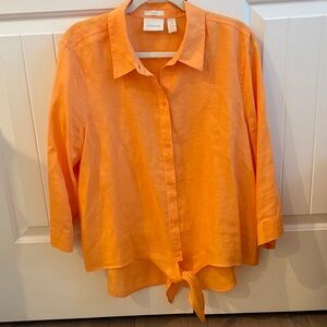 Chicos Size 3 “No Iron” linen. Orange- perfect for fall. 3/4 sleeves, buttons up the front and fabric tie at the bottom.