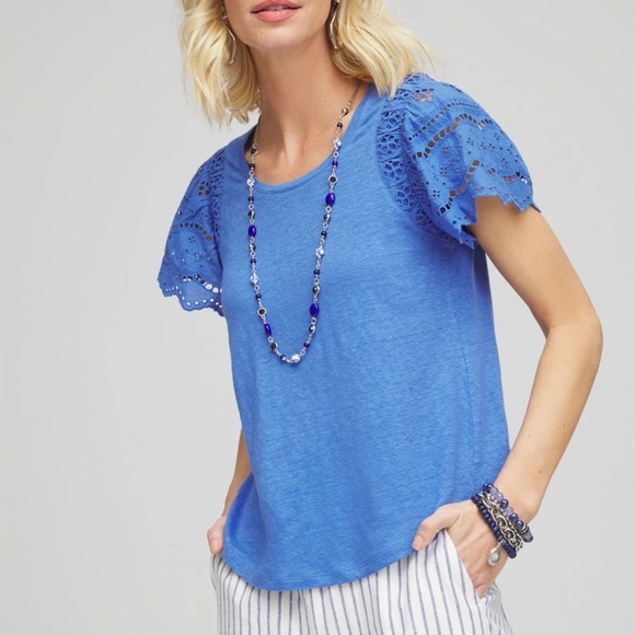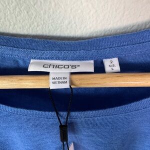 Chico's Linen Blue Embroidered Sleeve Blouse Size Large NWT