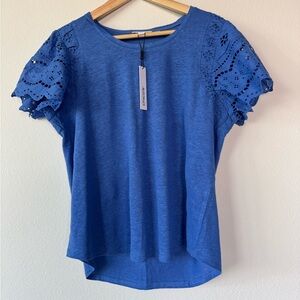 The prettiest tee. Showcasing short embroidered-lace sleeves for a classy casual style. Crafted with 100% linen that's lightweight and luxurious, perfect for the warmer months. Wear it with crops, ankle jeans, or shorts for a simple way to dress up your casual looks.