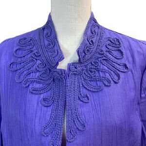 Chico's Linen Embroidered Open Jacket Blazer Purple. Crochet like embroidery around Neck and Collar.