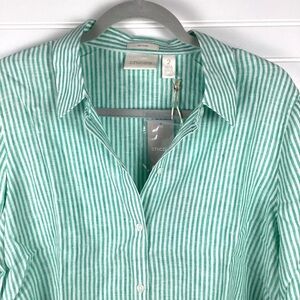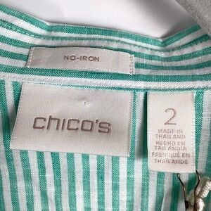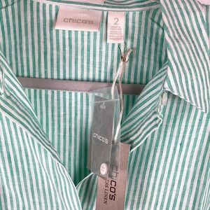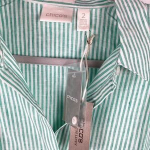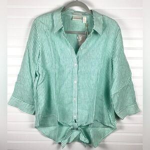 Chicos effortless Linen Lydia NWT No Iron Tie Front Shirt Large White & Graceful Green Stripe 3/4 Sleeve Size 2/Large