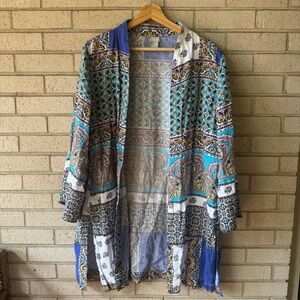 Chico’s linen topper, boho kimono jacket, paisley print cardigan, Chico’s size 2 M/L, resort wear layering, summer linen jacket, open front duster, Chico’s boho chic