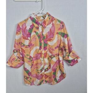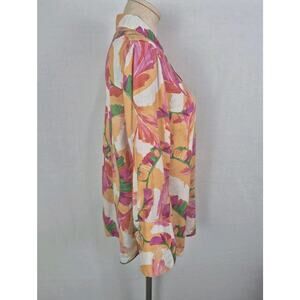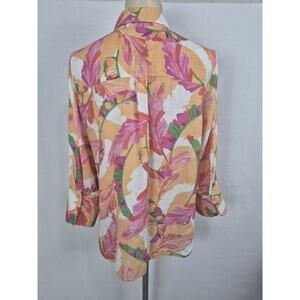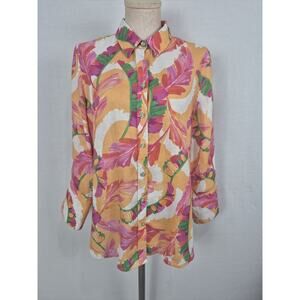 Bright and bold Chico’s 100% linen floral button front shirt in a vibrant tropical print with orange, pink, green, and white tones. Lightweight, breathable fabric—perfect for summer, vacation, or layering.