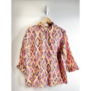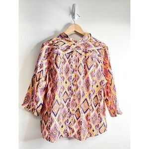 Chico’s Linen Shirt Womens Size XS IKAT Button Down 3/4 Sleeve