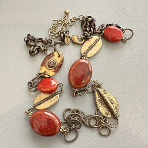 Chico's Long Beaded Chain Link Ceramic and Metal Statement Necklace. 36" with 3" extender chain. Aged patina look to metal. Ceramic beads are a mix between red and orange. Good condition!