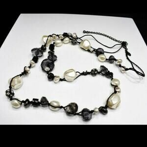 This is a beautiful long beaded necklace by Chico’s featuring a mix of pearlescent beads, rhinestone beads, smoky faceted beads, and black accent beads. The beads are hand-tied on two black cords with a gunmetal gray clasp and extension chain. This versatile piece can also be worn as a belt for a chic statement look. A lovely and eye-catching accessory perfect for any occasion.