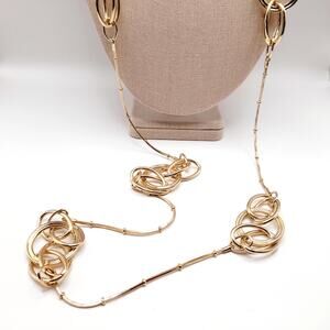This Chico’s long statement necklace is new with tags and features a striking design of smooth snake chain sections paired with bold interlocking loop clusters. The gold-tone finish adds shine and elegance, while the extra-long 48-inch length allows for versatile styling—wear it doubled, layered, or as a single dramatic strand.