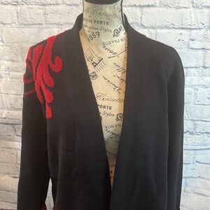 Chico’s Long Open Cardigan Sweater Duster Black with Red Design