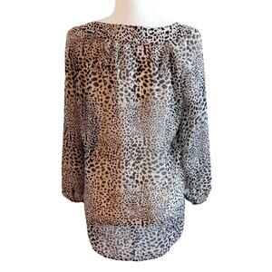 Chico's long sleeve top. Animal print. Sheer. Button pleated neckline.