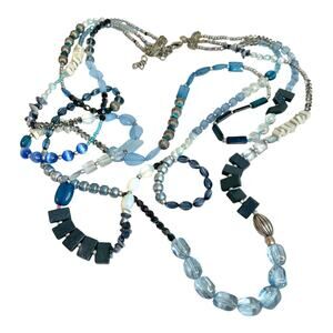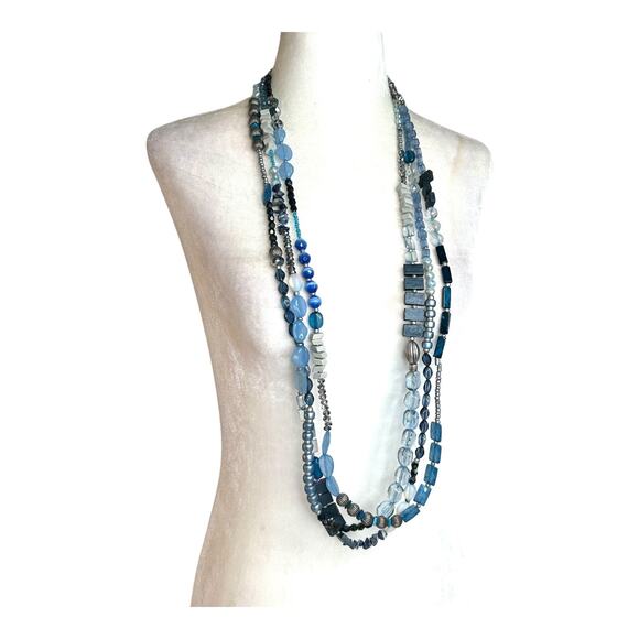 Chico’s Long Triple Strand Beaded Blue and Silver Tones Necklace