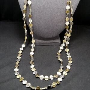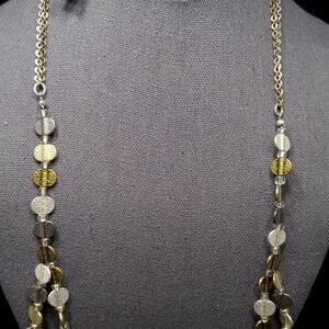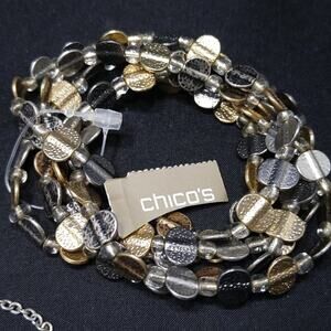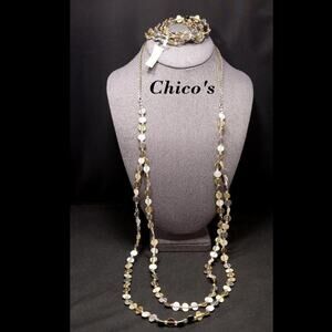 This is a great long Chico's necklace with two strands and matching bracelets that are five to the set. Both items have the Chico's tag without price and have never been worn. They would make a great gift or a perfect holiday set. They have both silver and gold tone on the beads and the lobster clasp and extension chain on the necklace is silver tone.