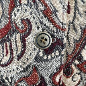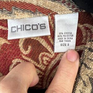 Chico's jacket features a beautiful paisley pattern and a button closure. It is made from a lightweight poly blend fabric, making it perfect for travel, business, or casual occasions. The mid-length jacket has long sleeves and a collared neckline, providing both warmth and style.