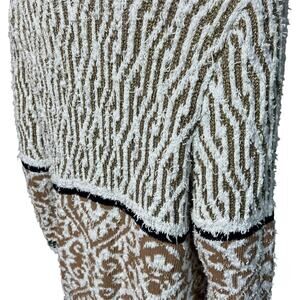 Stunning Chico's cardigan featuring a luxurious textured bouclé knit in a sophisticated white, gold, and bronze color scheme. This elegant open-front design showcases dual pattern styling with zebra-inspired stripes on the upper portion and an intricate damask pattern below, separated by a sleek black trim accent. The plush textured fabric combines 85% cotton, 8% polyester, 1% spandex, and 6% other fibers for comfortable stretch and structure. Perfect for layering over business attire or dressing up casual outfits. Size 2 (comparable to US M/L 12-14). Machine washable on gentle cycle with detailed care instructions provided on label. A versatile statement piece that effortlessly elevates any ensemble with its metallic thread detailing and artful design.