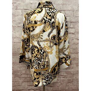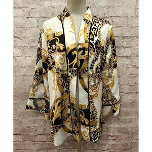 Chico’s M Reversible Kimono Jacket Open Front Black White Gold Filigree Cheetah