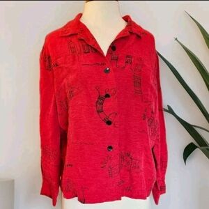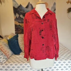 Chico’s M Silk-Linen Western Shirt Red Art Print Button-Up Blouse