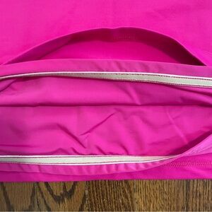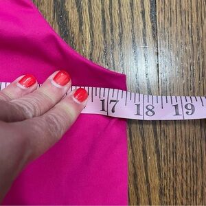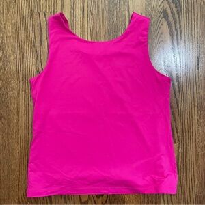 This is a ladies water tank by Chico's. It is a bright fuschia/magenta pink. It has a lining underneath with grip around the hem. It is a nylon and spandex blend, perfect for summer. The tank is a Chico's size 1, equivalent to a US small or size 8. It was worn once for amusement park water rides.