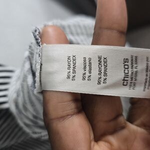 Chico's Maxi Skirt in size 2 (36 inches) features a stylish striped pattern in white and black. This skirt has an elastic waist for a comfortable fit and is made of a knit fabric blend of spandex and rayon. It is a long, flowing skirt that is perfect for any occasion, including travel, weddings, parties, cocktail events, casual outings, formal events, workwear, and business