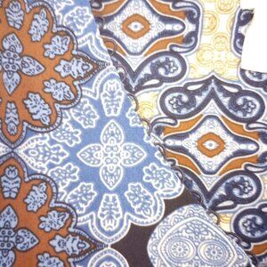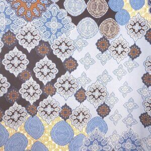 Chico's medallion print long sleeved blouse with elastic cuffs, and fabric covered buttons on the front. Pretty abstract print in blues, browns, and tan for an elevated boho look.