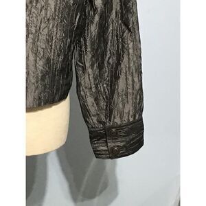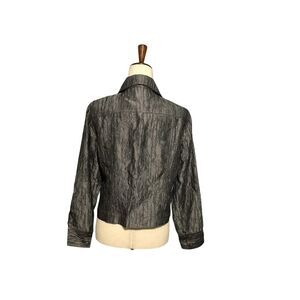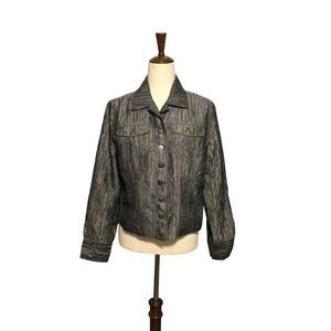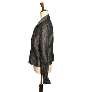 This Chico’s button-up jacket features a sophisticated gray hue with chest pockets for casual elegance. Crafted from a textured polyester-rayon blend, offering durability and comfort.