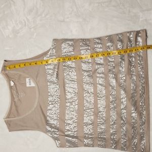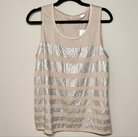 by Chico's sleeveless metallic strip tank top. Beige with silver faux sequin accents. Lightweight, perfect versatile holiday or warm weather piece. Cotton blend. Chico's size 2. NWT.