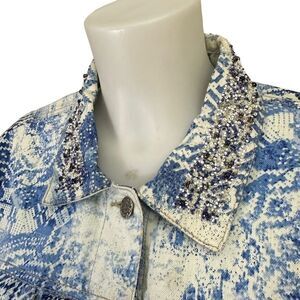 Chico’s Mixed Artisan Pattern Beaded Cropped Jean Jacket in Mysterious Blue XL