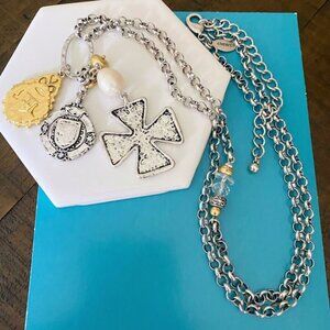 This Chico's necklace evokes an antique allure with its mixed metal charms, including a Maltese Cross and a pearl accent. Its adjustable chain offers versatility in length, while intricate details and craftsmanship make it a statement accessory reminiscent of timeless elegance.