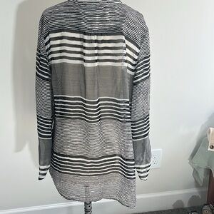 Chic striped top with a monochrome design. Ideal for versatile styling. Sheer material. Could be used as a cute cover up. Or I was more of an XL XXL and wore it as a shirt