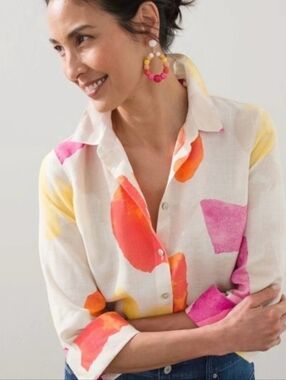 Discover the perfect blend of style and comfort with this Chico's casual button-down shirt. Featuring a classic white base with multi-colored stripes, this shirt offers a relaxed fit ideal for everyday wear. Its lightweight fabric ensures all-day comfort, making it a versatile addition to your wardrobe.