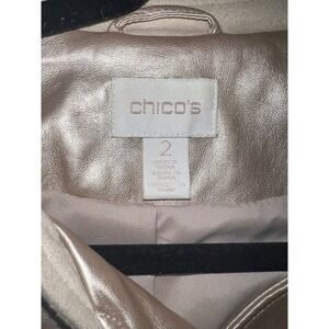 Keywords: Chico's jacket, moto jacket, faux leather jacket, metallic jacket, champagne jacket, suede trim jacket, asymmetrical jacket, size 2 jacket, women's jacket, retro jacket, vintage jacket, party jacket, evening jacket, casual jacket, gold jacket